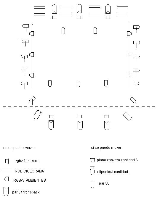 Foro Largo 11 mts del público a fondo negro Ancho 7 mts Alto 3.75 4 piernas negras por lado Cámara negra Ciclorama Linolium color negro, gris y blanco Telón azul 60 sillas de público plástico color negra 2 camerinos 1 salón para calentamiento 3 técnicos Audio Consola Serwin Vega de 12 canales 2 bocinas JBL de 400w 2 monitores 100w 4 equipos microfonía completos (pedestal cables y micrófono) marca shure 58 Snake para los 8 canales (El audio se puede reproducir con entrada plug 3.5) Laptop hp Iluminación Computadora con programa TITAN ONE 10.0 (100 páginas con 10 escenas cada una) 4 bancos de dimers de 8 x 2400w cada uno 6 Ambientales led RGB (con función luz negra y estrobo) 8 Barras led (únicamente colores primarios) ciclolight 6 lámparas fresnel 9 par 64 15 par 56 2 par 46 1 especial leko 1000w Video Monitor con cable vga (si llevan mac llevar adaptador) 2500 lumenes Utilería Mesa rectangular 1.50 x 50 cm 2 silla blanca Silla negra 2 bancas color negro 1.40 x 30 cm 1 banco Atril